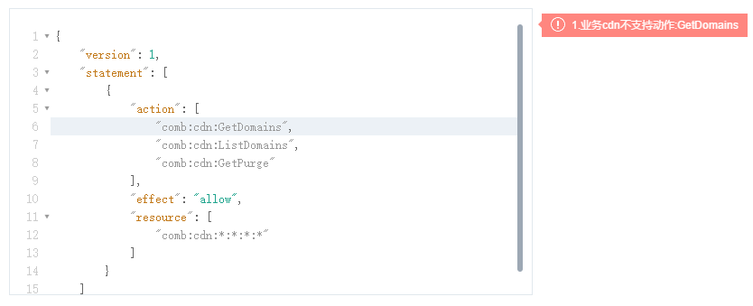 通过上面的策略语言,企业完全可以根据自身的实际需要来定义权限,具有非常大的灵活性和自由度。如果你以前使用过其他云的访问控制产品,那么上手会很快。如果是第一次接触此类产品,也不用担心,我们提供了一个强大了“编译器”来检查你的策略语法是否合法,并提供简单直观的错误展示来帮你迅速定位问题,如下图所示。