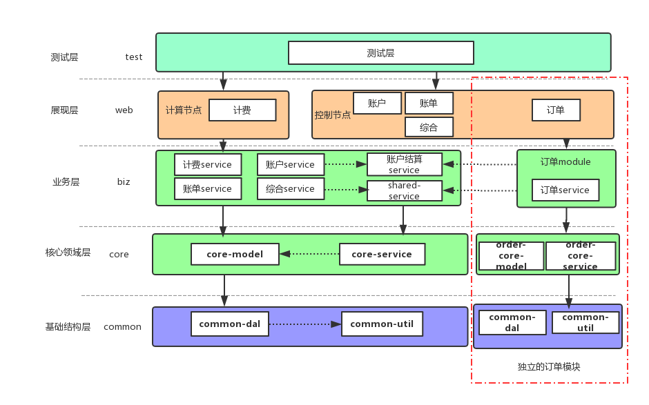 我们并没有独立拆分web层,因为系统还没有独立,web层作为统一的打包入口也承载着订单的流量。而且,Controller层的逻辑相对比较简单,完全可以在系统独立时再做。通过大家的努力,8月底订单已独立模块的方式上线了,一切正常。