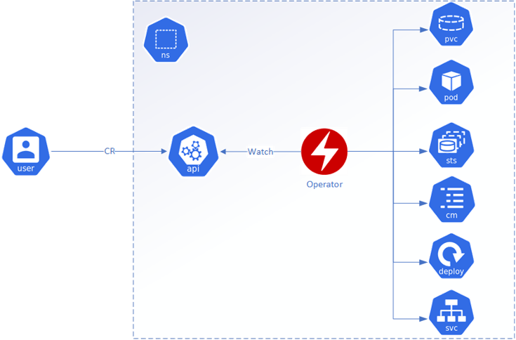 Operator通过Watch ApiServer来捕获CR的请求,然后创建对应的资源来“组装”成我们需要的集群。CR所属的子资源的状态也通过ApiServer反馈给Operator,Operator来做相应的协调处理,整个过程清晰明了。