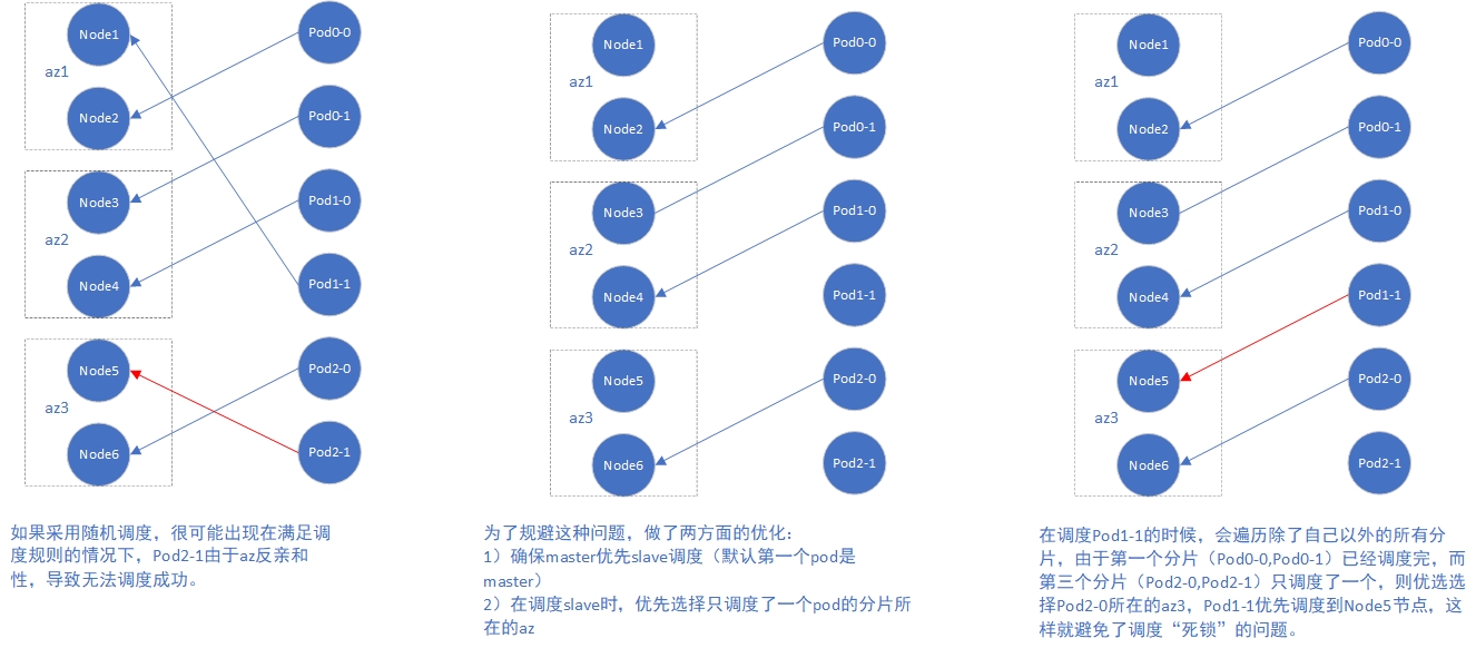 我们Redis Cluster采用了多个StatefulSet来管理分片,每个StatefulSet的0号Pod为主分片,1号Pod为复制分片,要求多机房的情况下主分片和复制分片不能在同一个机房。如果由K8S随机调度,那么有可能就会发生死锁问题,可调度的Node越少发生死锁的概率就会越高。下图详细说明发生这一问题的过程,已经目前我们的解决方法。